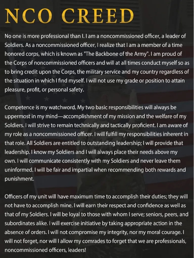 As a noncommissioned officer, i realize that i am a member of a time honored corps, which is known as “the backbone of the army.” i am. I am aware of my role as a noncommissioned officer. I am a noncommissioned officer, a leader of soldiers. All soldiers are entitled to outstanding. Nco creed_.f army values no one is more.